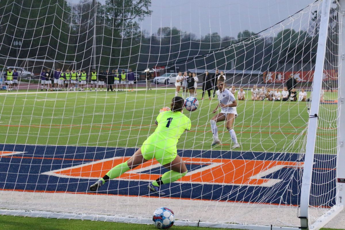 Habersham Central High School senior goalkeeper Riley Wilson (1) saves a penalty kick against North Forsyth High School Tuesday, April 9 in Mt. Airy. (Zack Myers/NowHabersham.com)