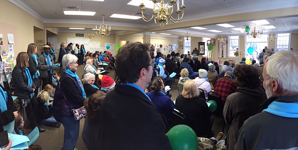 It was a bright and chilly afternoon. The spirit of the group was optimistic and cheerful in spite of the cold. We gathered at the gazebo in Clarkesville. As we greeted those we knew and introduced ourselves to new friends, blue scarves were handed out. Not only were they a welcome respite from the cold, they also served as a call to peace and unity. Soon all of the participants were wrapped in aqua warmth. Fitting that we represented “many waves; one ocean.”