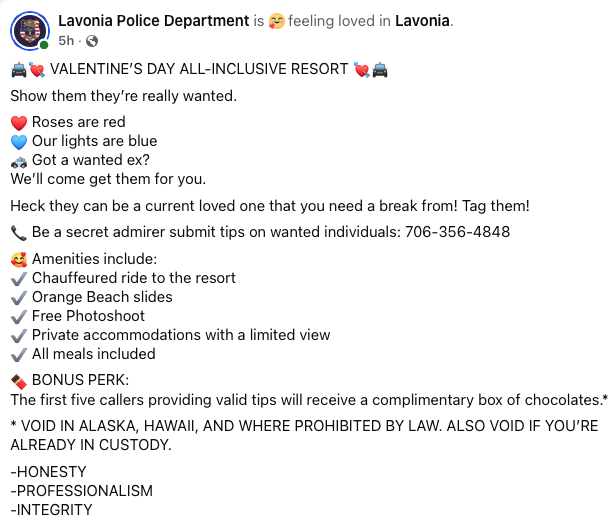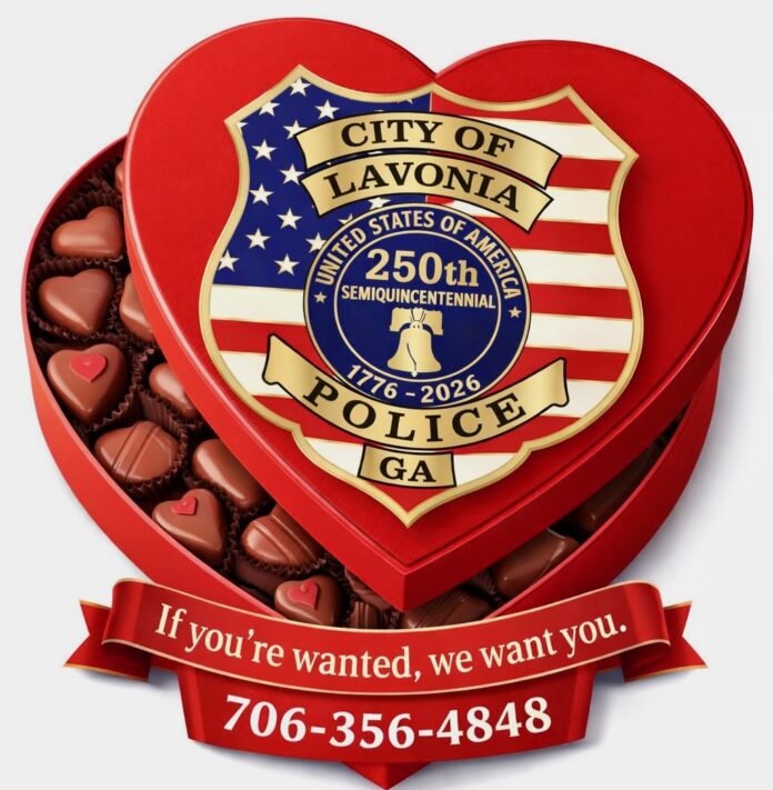 The post, shared on the department’s Facebook page ahead of Feb. 14, plays off the holiday’s themes of love and relationships while weaving in a subtle public safety message. In typical Lavonia PD fashion, the message balances playful humor with a reminder that officers are still on duty — even on Cupid’s busiest day of the year.