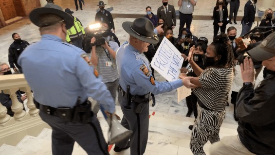“We’ve got to keep in mind that the rotunda is one thing,” he said. “That’s a designated public forum, and so the state can’t engage in viewpoint discrimination for the rotunda. The rest of the Capitol is offices, so the analysis would be no different from someone knocking on your chambers doors and disrupting you.”