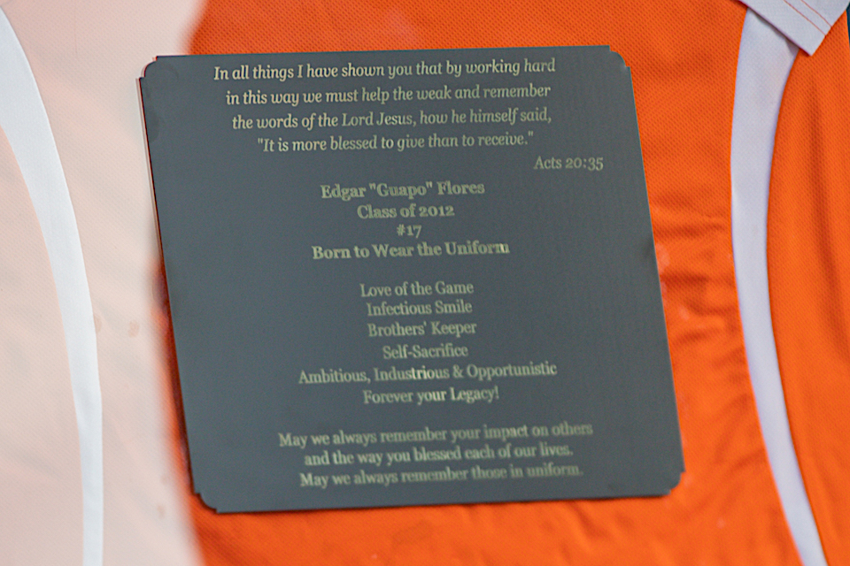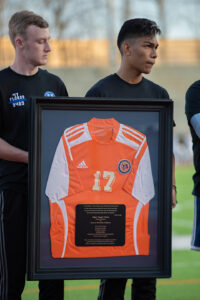 In a moving pre-game ceremony, the Habersham Central Raider soccer team presented Flores’ mother, fiancée, and brother with a jersey with his team number on it. They included a plaque with the #17 jersey that included a scripture verse and the phrase, “Born to Wear the Uniform.”
