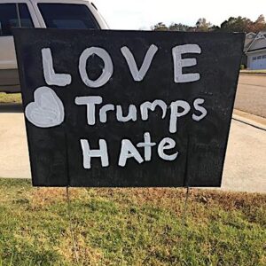 Within hours of removing the yard sign from her yard, Bailey repainted it and put it back. It still shows her support for her chosen candidate but it also bears a different, deeper, more meaningful message: On one side it now reads ‘Love Trumps Hate’.