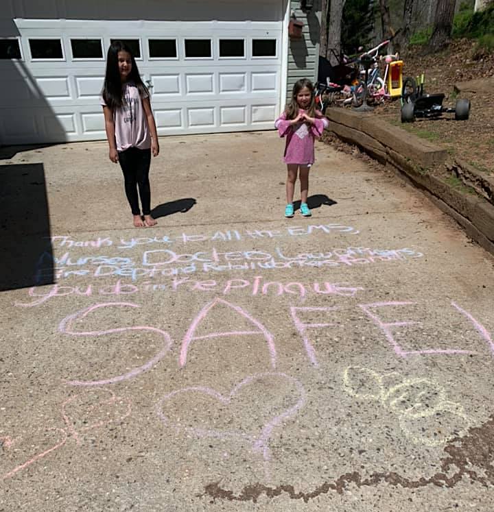 “Thank you to all the EMS, Nurses, Doctors, Law Officers, Fire Dept and Retailers for all you do in keeping us safe,” their sidewalk chalk message reads. It’s followed by a big pink heart.