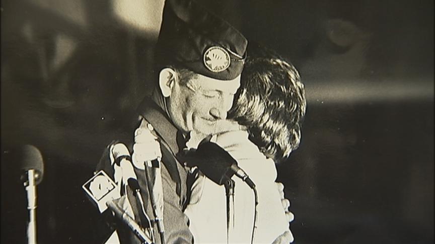 Col. Ben Purcell hugs his wife, Anne, for the first time in five and a half years upon his return home from the Vietnam War. Purcell was the highest ranking US Army officer held as a prisoner of war in Vietnam. The Purcells were reunited on March 30, 1973 at Bush Airfield at Fort Gordon in Augusta, GA. They returned home to their native Habersham County when he retired from the Army in 1980. Ben and Anne celebrated their 62nd wedding anniversary in January of last year. He died on April 2, 2013.