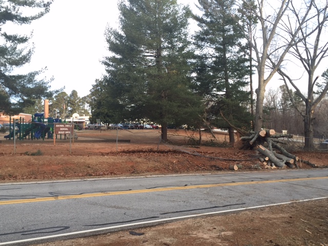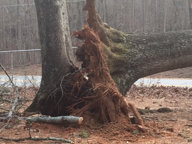 A crew from McAllister’s Tree Service surveys the damage and prepares to remove a tree that blew down on the Hazel Grove Elementary School playground yesterday. High winds and cold temperatures returned to Habersham with a vengeance on Thursday. Habersham County Emergency Management Agency Director Lynn Smith says the agency is preparing for more winter weather that’s expected to blow into the county next week.