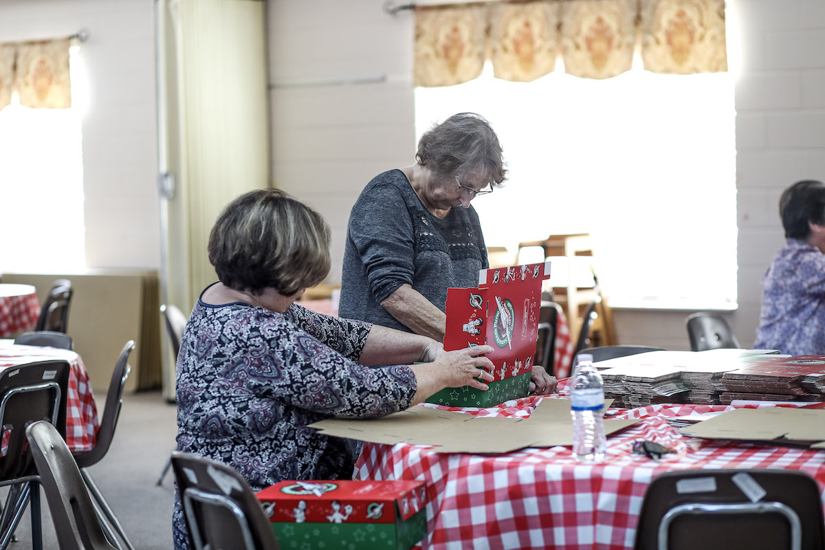Volunteers have converted the fellowship hall at Bethlehem Baptist Church in Clarkesville into a Christmas workshop. This week, they’re using the space to prepare hundreds of shoebox gifts for Operation Christmas Child. A group of women from Redeemed Ministries worked on the project Tuesday. They lovingly packed each box for the designated age and gender of the child who will receive it.