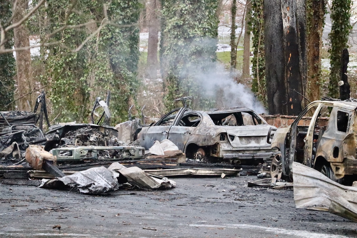 The carport collapsed during the fire. All four vehicles inside were destroyed.