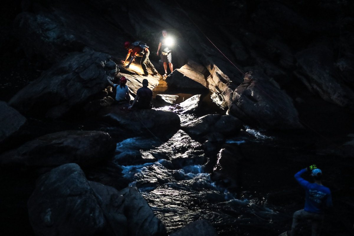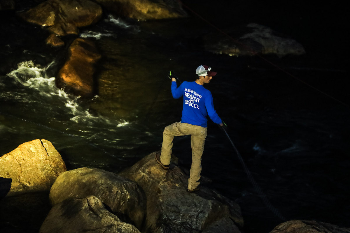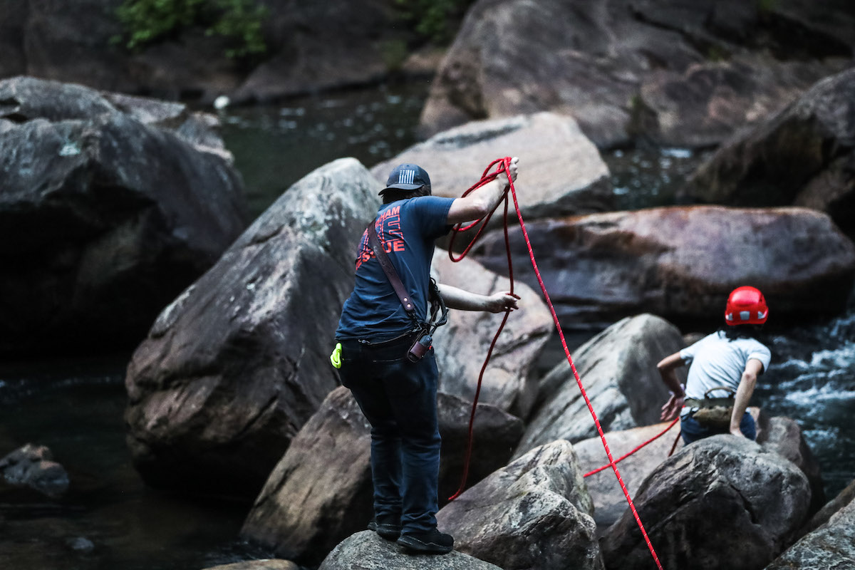 While one search team rappelled down to the hikers, another team assembled a high line across the river on the floor of the canyon. After reaching the hikers, the first SAR team lowered them to the other team which helped them safely cross the river and reach the stairs.