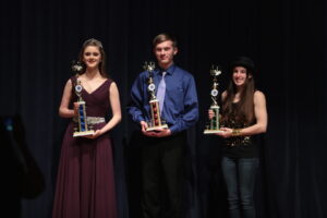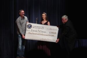 Local realtor/singer Alan Baker performed for the audience.Middle schooler Zoe Simmons dresses and sings the part of Elphaba from the Broadway musical “Wicked.” Here she performs the song, “No Good Deed.”Sam Warren adds color to the stage with his first-place finishing rendition of “A Million Dollar Dream.” Third place middle school finisher, Blew Meeks, performs “Scherzo” by Carl Von Webber.Destiny Holland took third place in the high school division with her vocal performance of “Cabaret.”Cash Laws sings “Evermore.” He placed 2nd in the high school division.Elementary Division performers (l-r): Katherine Grace Chitwood, Josie and Brayden Bixler, and Ashley Jones smile as the crowd applauds them.Middle School Division performers take a final bow. They are, in random order, Blew Meeks, Sam Warren, Ariel Standridge, Zoe Simmons, Brianna Hope Justice, Adrian Ramsey, Katlyn Vison, and Ariel Schwartz.High School Division performers bow at the end of the competition. They are, in random order, Chandler Bowen, Noah Bowen, Lennon Lester, Rebekah Culpepper, Jesselle Witter, Brandi Thomas, Emerald Patterson, Cash Laws, Desinty Holland, and Caleb Rodgers.Trophies were awarded to the top three finishers in each division.Brianna Hope Justice, a middle schooler, won the People’s Choice award. Elementary Division winners (l-r): Brayden Bixler, 1st; Josie Bixler (w/Brayden Bixler), 2nd; Ashley Jones, 3rd.Middle School Division winners (l-r): Sam Warren, 1st; Zoe Simmons, 2nd; Blew Meeks, 3rd.High School Division winners (l-r) Emerald Patterson, 1st; Cash Laws, 2nd; Destiny Holland, 3rd.First place high school winner Emerald Patterson took home a trophy and the $500 Bill Loyd cash prize. The prize is named in honor of longtime Cornelia Kiwanis member Bill Loyd. Alan Baker (left) and Cornelia Kiwanis President David Wonders present her with the check.