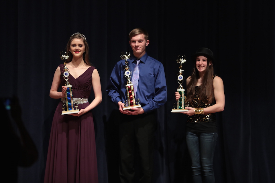 Cornelia Kiwanis President David Wonders (far right) joins the winners on stage at the 37th Annual Cornelia Kiwanis Talent Showcase. The event was held Feb. 23, 2018 in the Habersham Central High School Auditorium in Mt. Airy. (photo/Daniel Purcell)