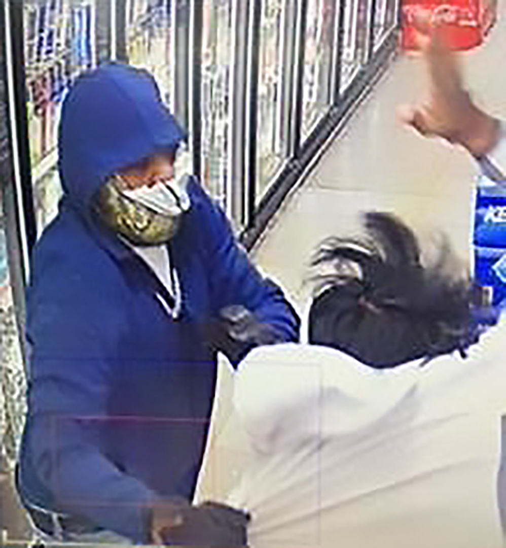 Surveillance images show the robber wearing a mask, a blue hoodie, and light-colored blue jeans with rips and holes. Additionally, it appears the suspect was wearing a white undershirt, blue pants or shorts under the jeans, black shoes, black gloves, and a silver chain around his neck.