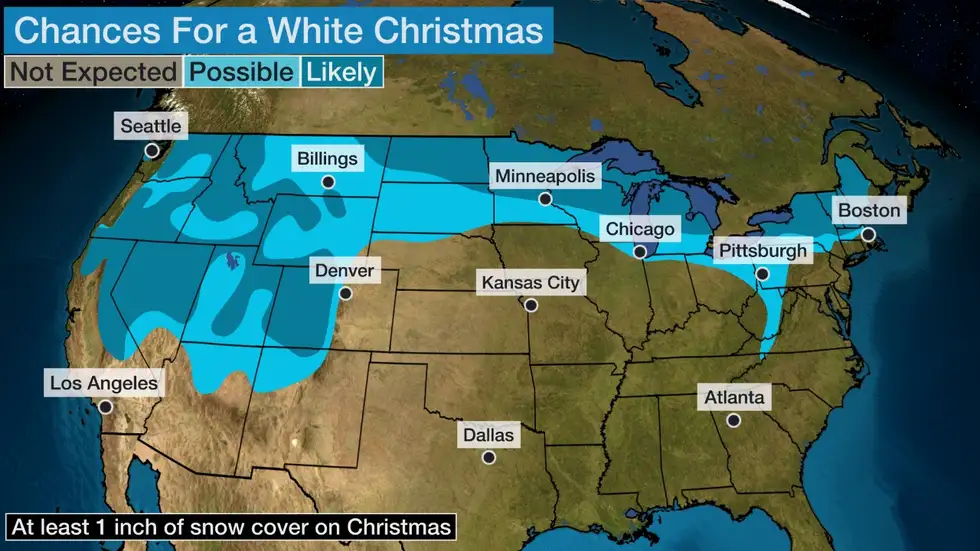 If you’re dreaming of a white Christmas, you’d better head north. Meteorologists predict snow in the Mountain West and from northeast Montana into northern Michigan and parts of upstate New York into northern New England. According to the Weather Channel, lower chances for a white Christmas exist from portions of the Northern Plains into the upper Midwest and the interior Northeast and Appalachians.