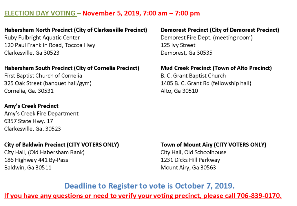 You must vote at your assigned precinct (see list below) and have a proper ID. Visit the Georgia Secretary of State’s election website for a list of acceptable voting IDs.