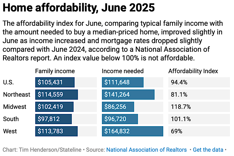 Nationally, affordability increased slightly compared with June of 2024, with the typical family making $105,431, about 94% of the $111,648 it would need to buy the median-priced home. That’s up from about 92% in June 2024.