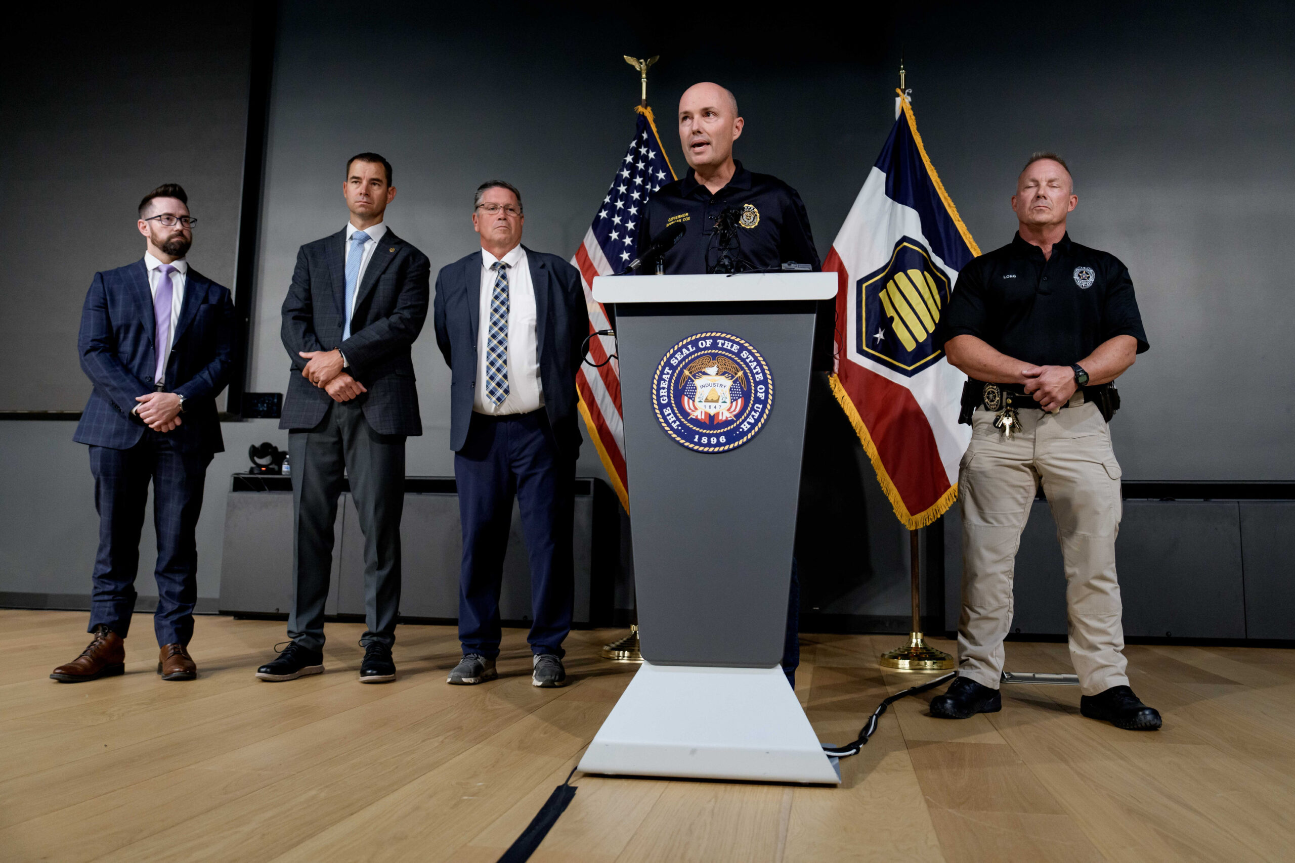 Utah Valley University Vice President Val Peterson, FBI Special Agent in Charge Robert Bohls, Utah DPS Commissioner Beau Mason, Gov. Spencer Cox, and UVU Police Chief Jeffrey Long, left to right, talk to media after conservative political commentator Charlie Kirk was shot and killed during an event at Utah Valley University in Orem on Wednesday, Sept. 10, 2025. (Spenser Heaps/Utah News Dispatch)