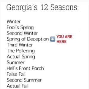 The iris and daylilies are starting to wake from a long winter’s nap. Their strappy leaves are poking up through the soil in my flower beds and containers. I gently lifted the mulch from the container holding my prized peony and I could see signs of new growth. Buds on my hydrangeas are beginning to emerge. The Japanese or saucer magnolias throughout the state are coming to life with their huge pink and white blooms, soon to be followed by daffodils popping up here, there, and everywhere. I love this time of year when some mild temperatures and sunshine are sandwiched between the chill of winter. In Georgia, our weather can best be described in memes that are prolific on social media.