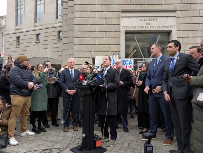 “We are not going to let this injustice happen. Congress created this agency with the Foreign Assistance Act of 1961 and if you want to change it, you got to change that law,” Rep. Gerry Connolly of Virginia told a large crowd that gathered outside the Ronald Reagan Building and International Trade Center, where the agency is housed.