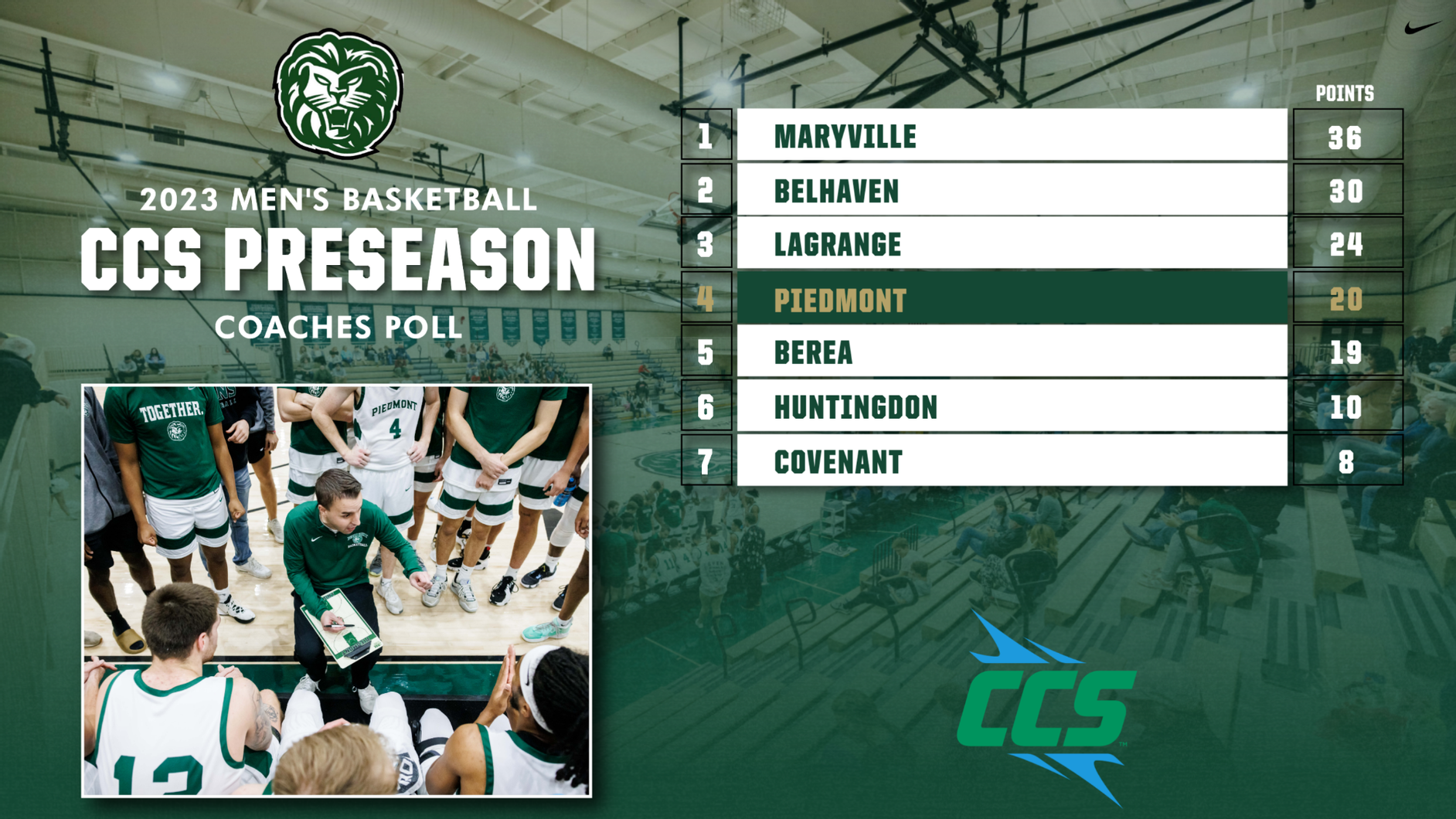 ATLANTA – The Piedmont men’s basketball team was selected fourth overall in the Collegiate Conference of the South Preseason Coaches Poll announced Wednesday.