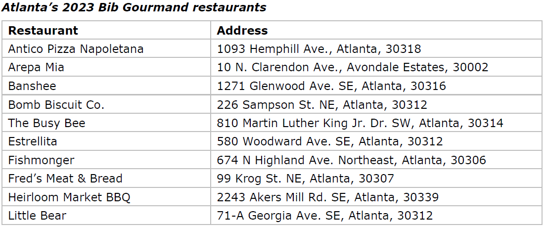 The MICHELIN Guide inspectors gave 10 restaurants the Bib Gourmand distinction, which recognizes eateries for great food at a great value: Antico Pizza Napoletana, Arepa Mia, Banshee, Bomb Biscuit Co., The Busy Bee, Estrellita, Fishmonger, Fred’s Meat & Bread, Heirloom Market BBQ and Little Bear.