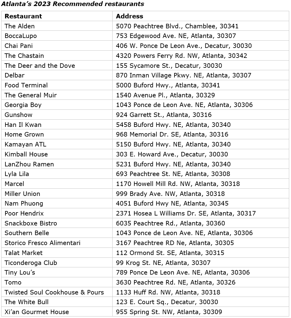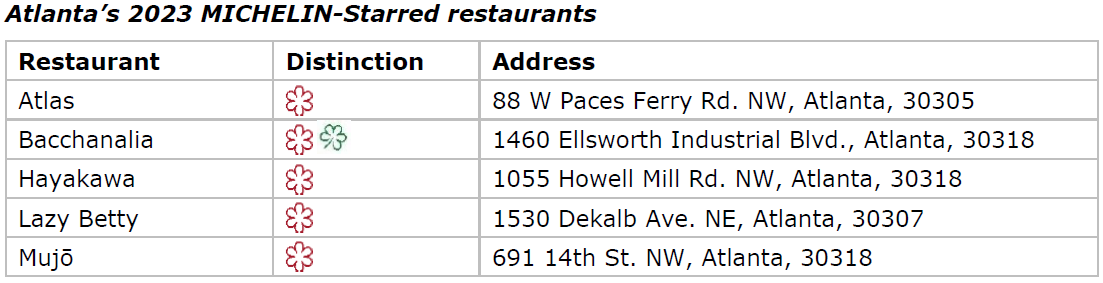 “Our famously anonymous inspectors enjoyed experiencing Atlanta and its dynamic culinary landscape,” said Gwendal Poullennec, the International Director of the MICHELIN Guides. “They came away impressed with the diverse offerings, as the selection of restaurants not only reflects a taste of the South, but also has a good deal of international flavor. There is so much for foodies to savor here. Whether they’re local residents or international travelers, they’re in for a treat!”