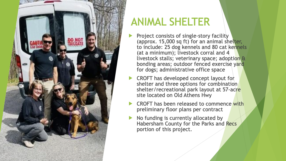 The Animal Shelter will be a single-story facility with 15,000 sq. ft. The new facility will house at least 25 dog kennels and 80 cat kennels. It will have a livestock corral and 4 livestock stalls. It will have space for veterinarian use, adoption and bonding area, and administrative offices. It will have a fenced area for animals to exercise. A concept plan for the Animal Shelter / Parks & Rec area has been developed with three layout options on a 57-acre tract of land on Old Athens Hwy. The county has given the go ahead for the preliminary floor plans to be developed for the animal shelter. In this concept, there is currently no funding source for the Parks and Rec portion of the project.