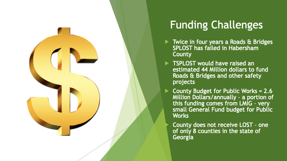 During the state of the county address, Harkness and Vaughn identified the challenges that the county faces at this time. The TSPLOST has failed twice in four years. This last TSPLOST would have generated approximately $44 million for the county and the cities for road and bridge projects. The county has an annual budget of $2.6 million for Public Works with a portion of that coming from the state’s LMIG grant. The county does not receive LOST and is only one of eight counties in the state that doesn’t receive those funds. Funding is a problem for all major projects, Harkness and Vaughn said. Costs for those projects are coming in significantly higher due to high inflation and supply chain issues. Vaughn stated that “the county does have a revenue problem. I really don’t know how to say it.” She continued, “The county’s budget is challenging. We don’t have a lot of areas for growth in revenue.”