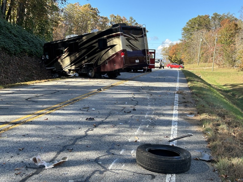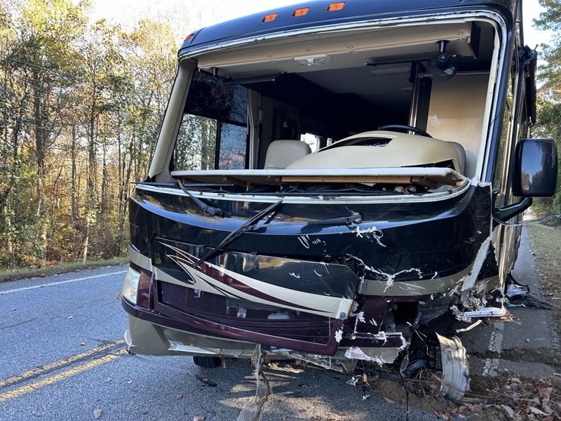 The RV involved in Monday afternoon’s wreck on Ga. 17 has extensive damage the front end as a result of the collision. (Rob Moore/Habersham County photo)