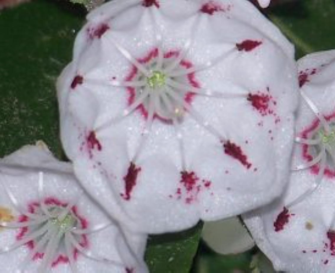The Mountain Laurel (Kalmia latifolia) is a somewhat twisted, multi-stemmed evergreen shrub. A perennial, it is native to the Eastern United States where it is found in a variety of natural settings, ie: deep woods, open sandy meadows and hillsides and even mountain tops. It is dense and round and can grow to 15 to 20 feet tall at maturity. It is a member of the Heather Family (Ericaceae).
