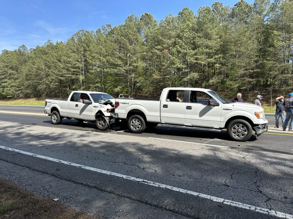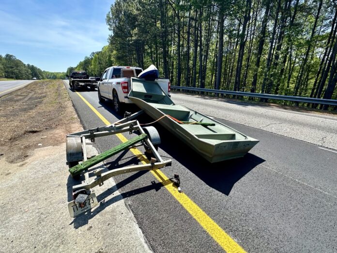The pick-up truck pulling this small boat and trailer was among 4 vehicles that wrecked on GA 365 South in Demorest on April 23, 2024. (Rob Moore/Habersham County)