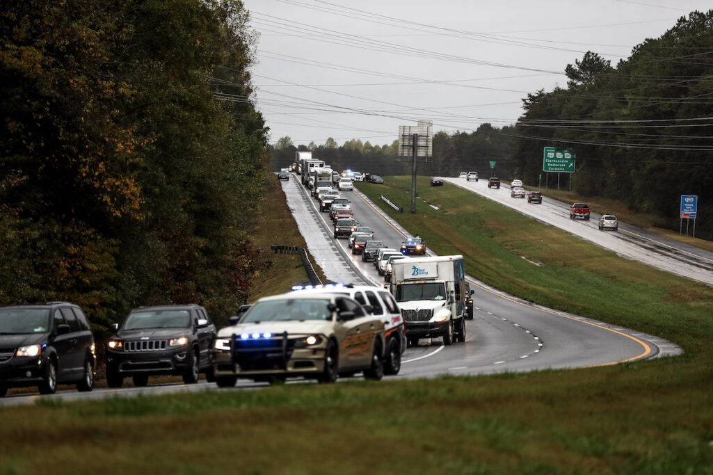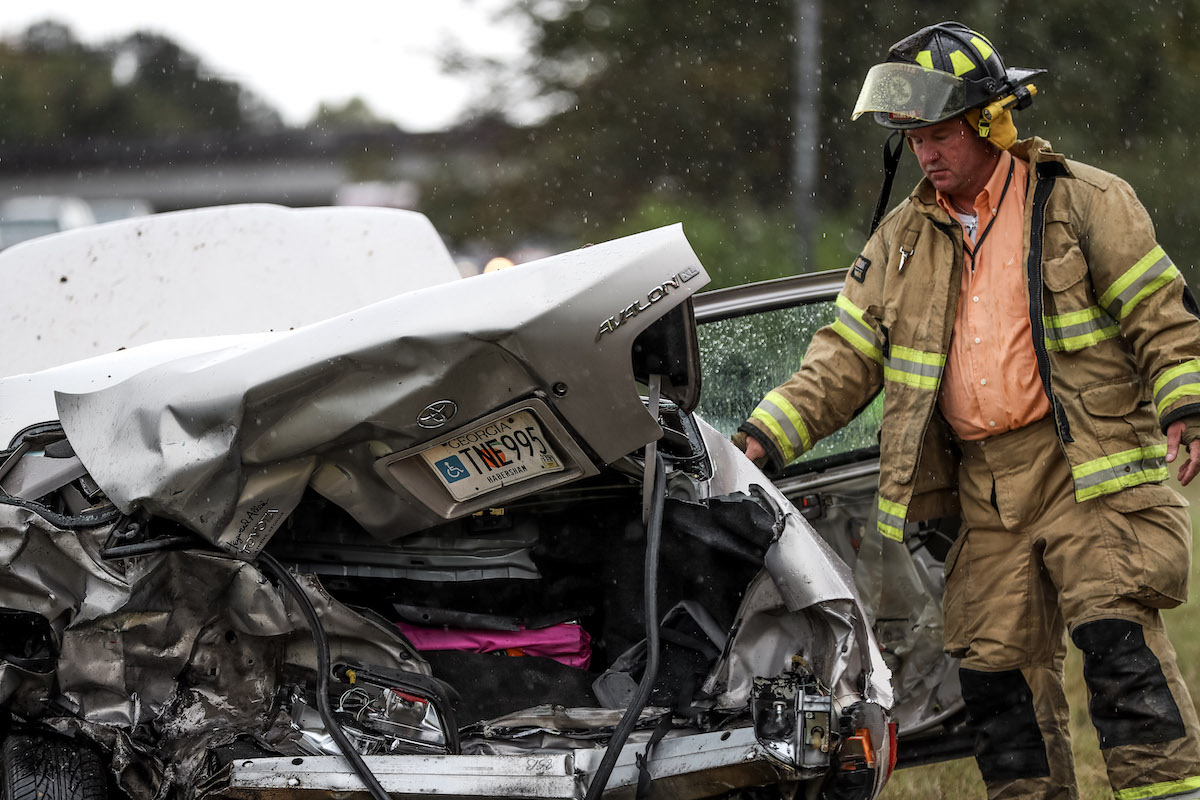 According to the State Patrol, the first wreck happened when a White Honda Civic traveling north on GA-365 blew a tire and ran into the median. The car then struck a road sign.