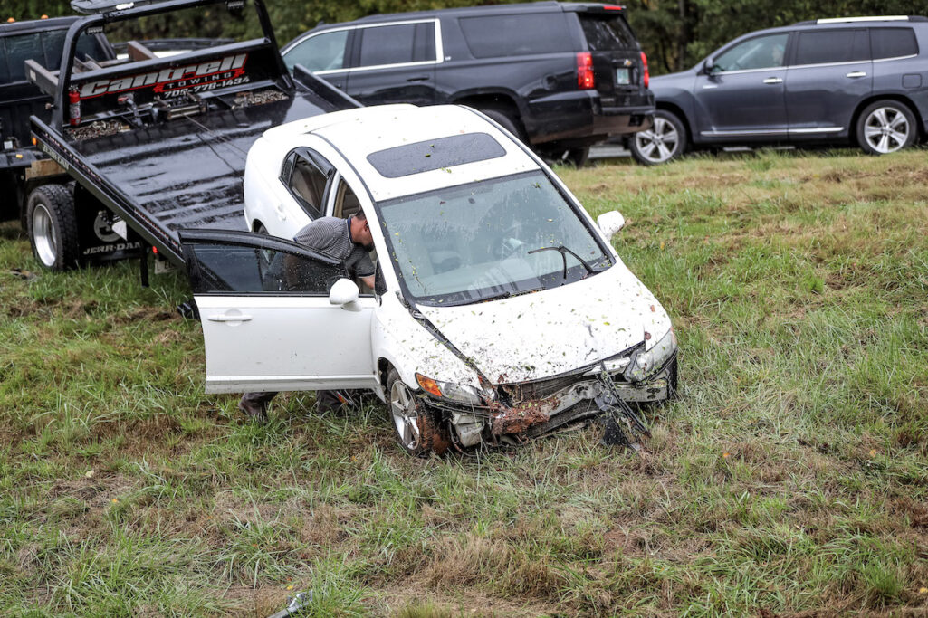 About the same time, a Grey Toyota Avalon came off of the on-ramp onto GA-365 southbound and was rear-ended by a Blue Honda CRV. Those vehicles also ended up in the median.