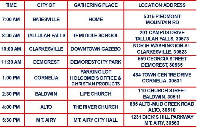 Habersham County National Day of Prayer Rolling Prayer Revival: Multiple prayer gatherings will be held across Habersham County, including locations in Alto, Baldwin, Clarkesville, Demorest, and Cornelia (see schedule below).
