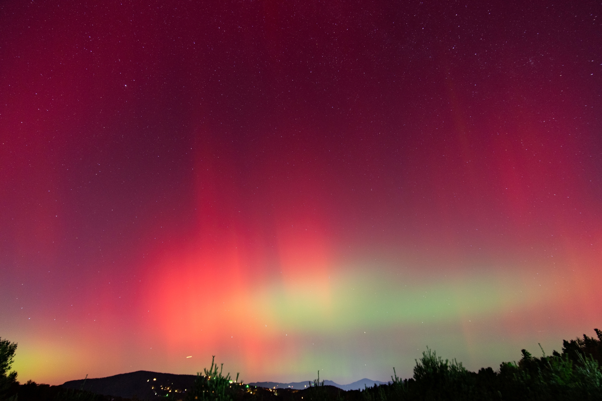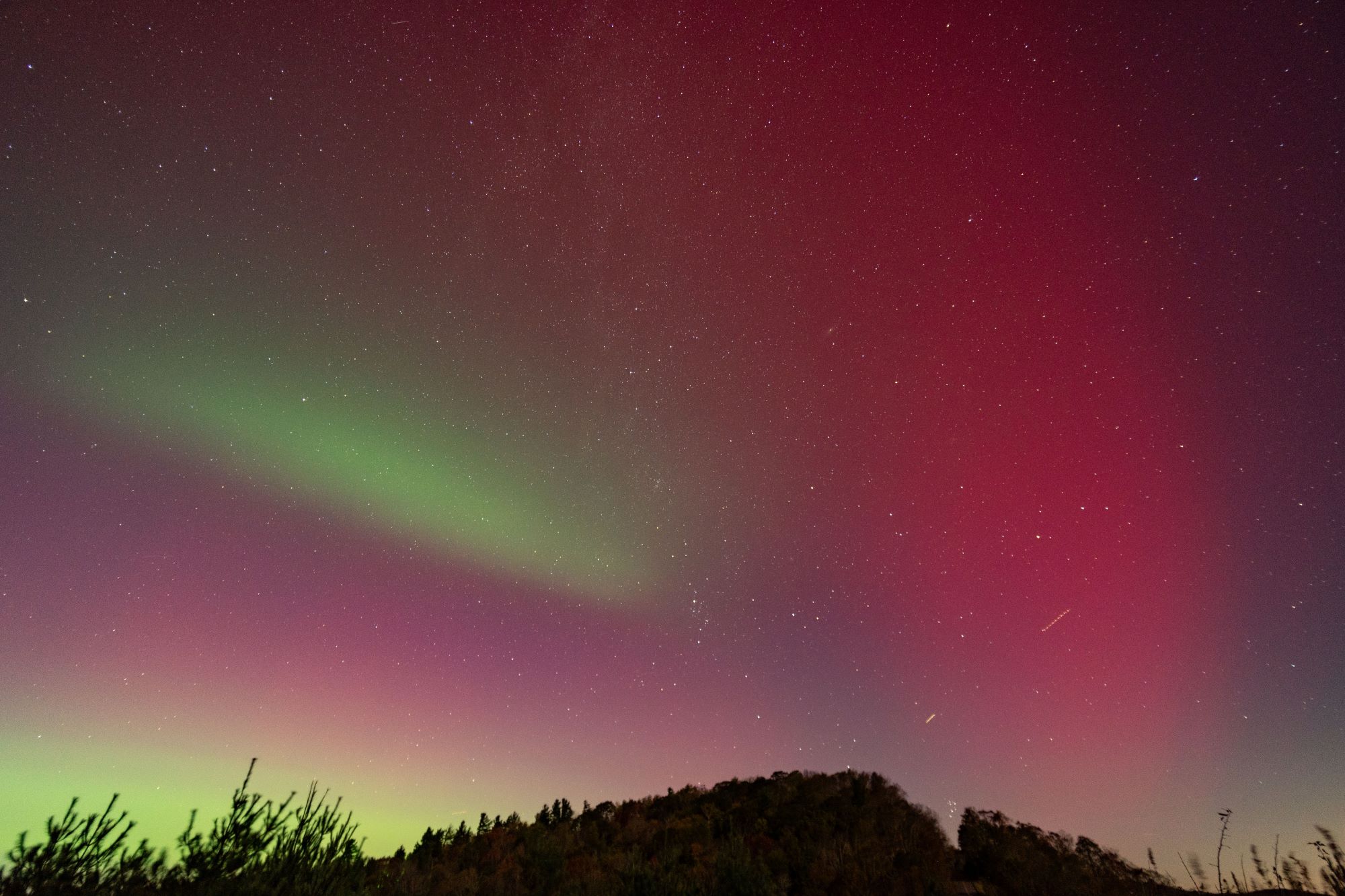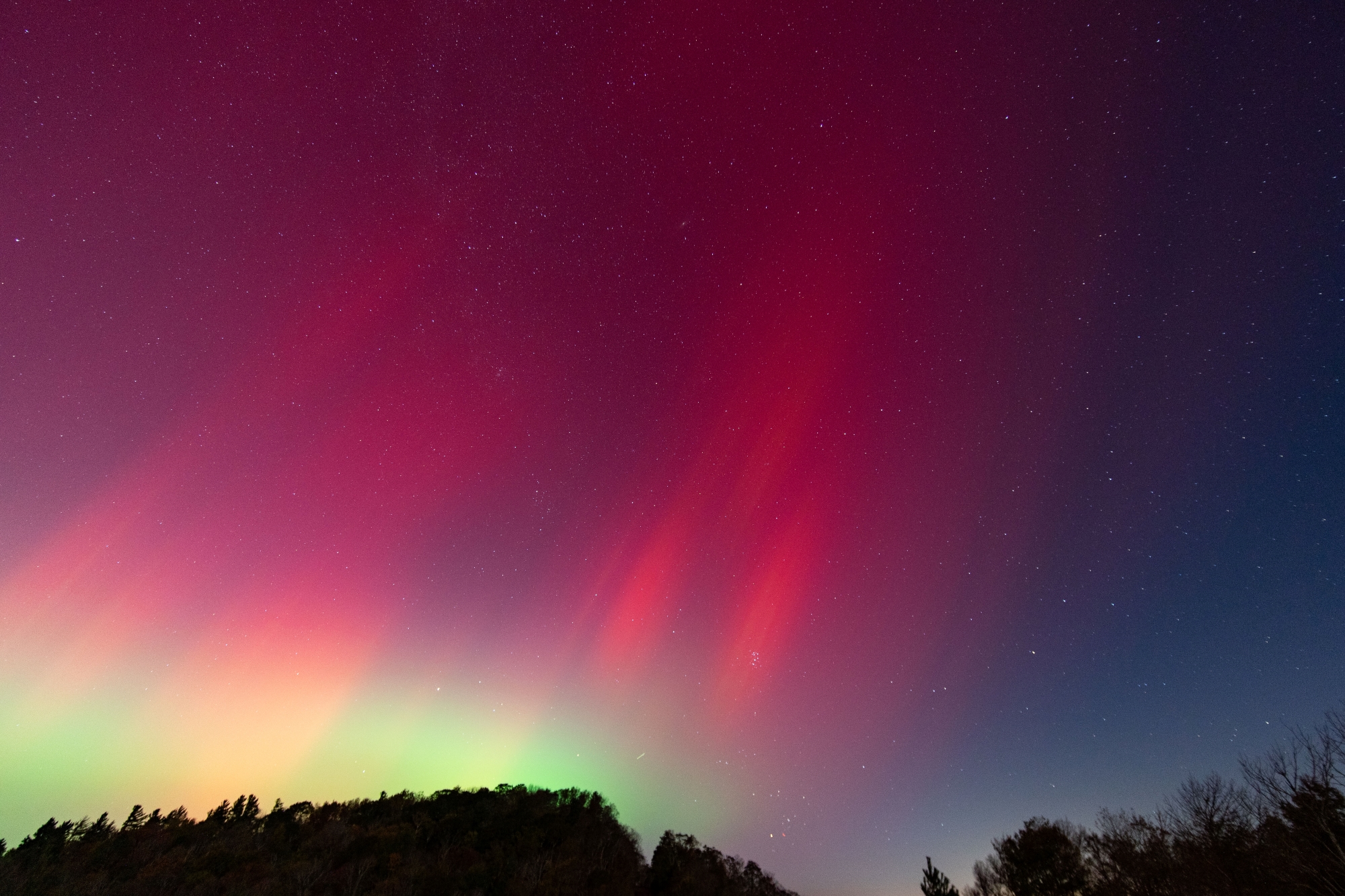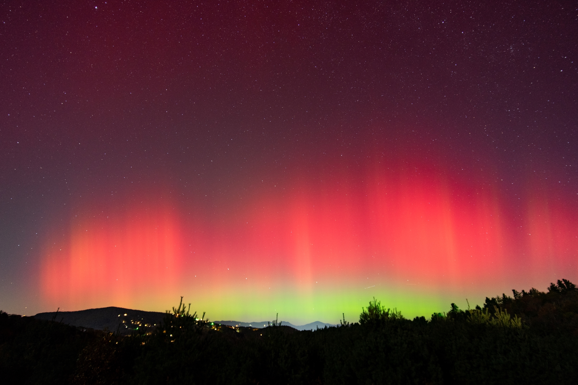 When the sun set on Thursday, Oct. 10, I knew pretty quickly it would be a great show. I could see pink and purple in the sky before it was fully dark, a first for me, so I quickly sped out of the house. With the recent damage from Helene, my favorite aurora spot was closed off due to road damage. So, I headed to another favorite star-watching spot on Thunder Hill outside Blowing Rock, NC.