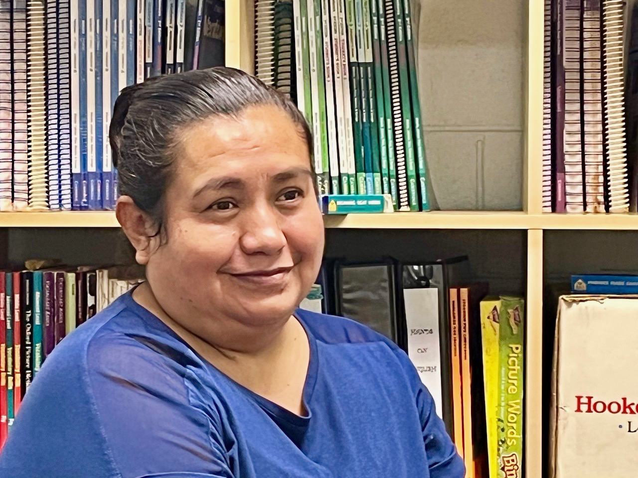 Margarita Gonzalez, pictured in front of the learner materials for VFL’s English Language Acquisition Program, cares for preschoolers and helps get them ready for school while their parents are in English classes. (Margie Williamson/Now Habersham)