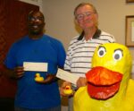 Volunteers for Literacy rubber duck race winners Randy Hatcher, left, and Larry Haydon pose with their winning ducks and prize winnings. Hatcher, of Cornelia...