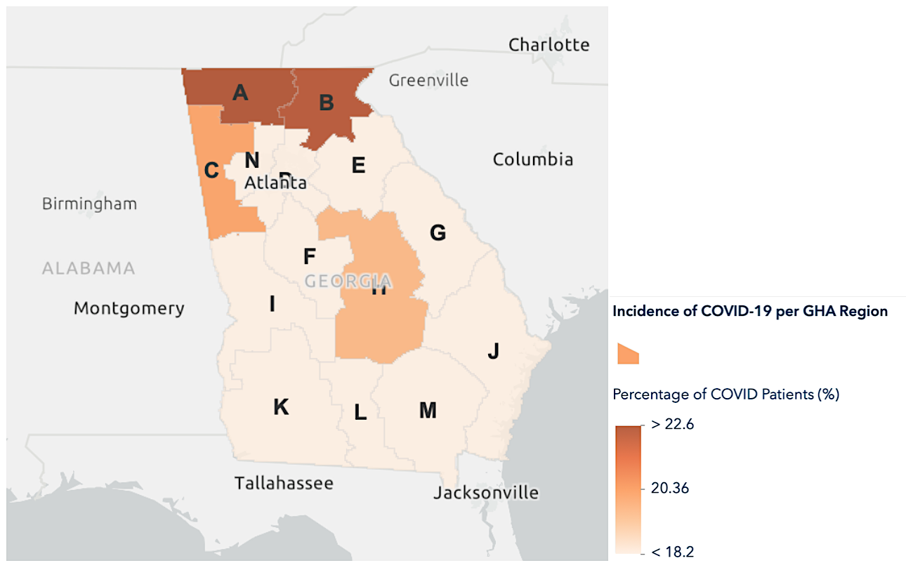COVID hospitalizations are up across North Georgia and hospital bed capacity is at critical levels. Nearly one-fourth of all patients currently hospitalized in the ten-county Region B area are classified as COVID-19 patients and another 6.8% of the 792 admissions as of December 2 were considered PUI – or patients under investigation for COVID.