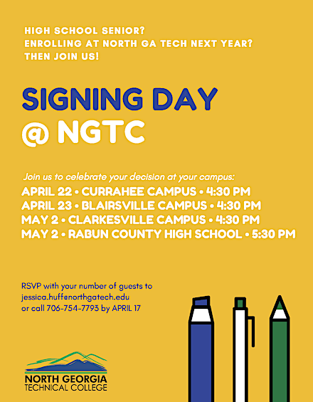 New recruits to North Georgia Technical College (NGTC) will now get a chance to celebrate their college choice with their families. NGTC is launching Signing Days this year. High school seniors who plan to attend NGTC in the fall are invited to attend.