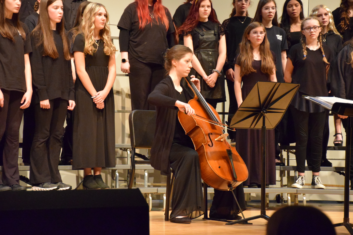 The eighth-grade students delivered an emotionally charged performance of “In Flanders Fields,” accompanied by cellist Naomi Woodbury. Their second song, “White Winter Hymnal,” was enhanced by a group performing hand percussion, as well as a small vocal ensemble, creating a magical and harmonious atmosphere.