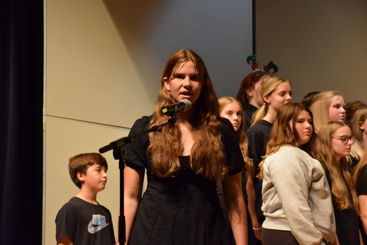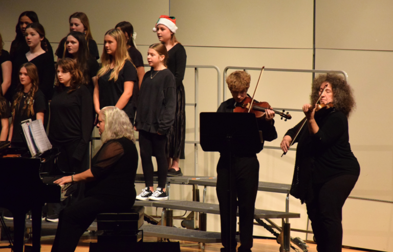 The seventh-grade students followed, singing “Battle Above the Clouds,” accompanied by violinists Hunter and Heather Strachan. They also performed the festive “St. Nick at Night,” delighting the audience with their vocal talents.