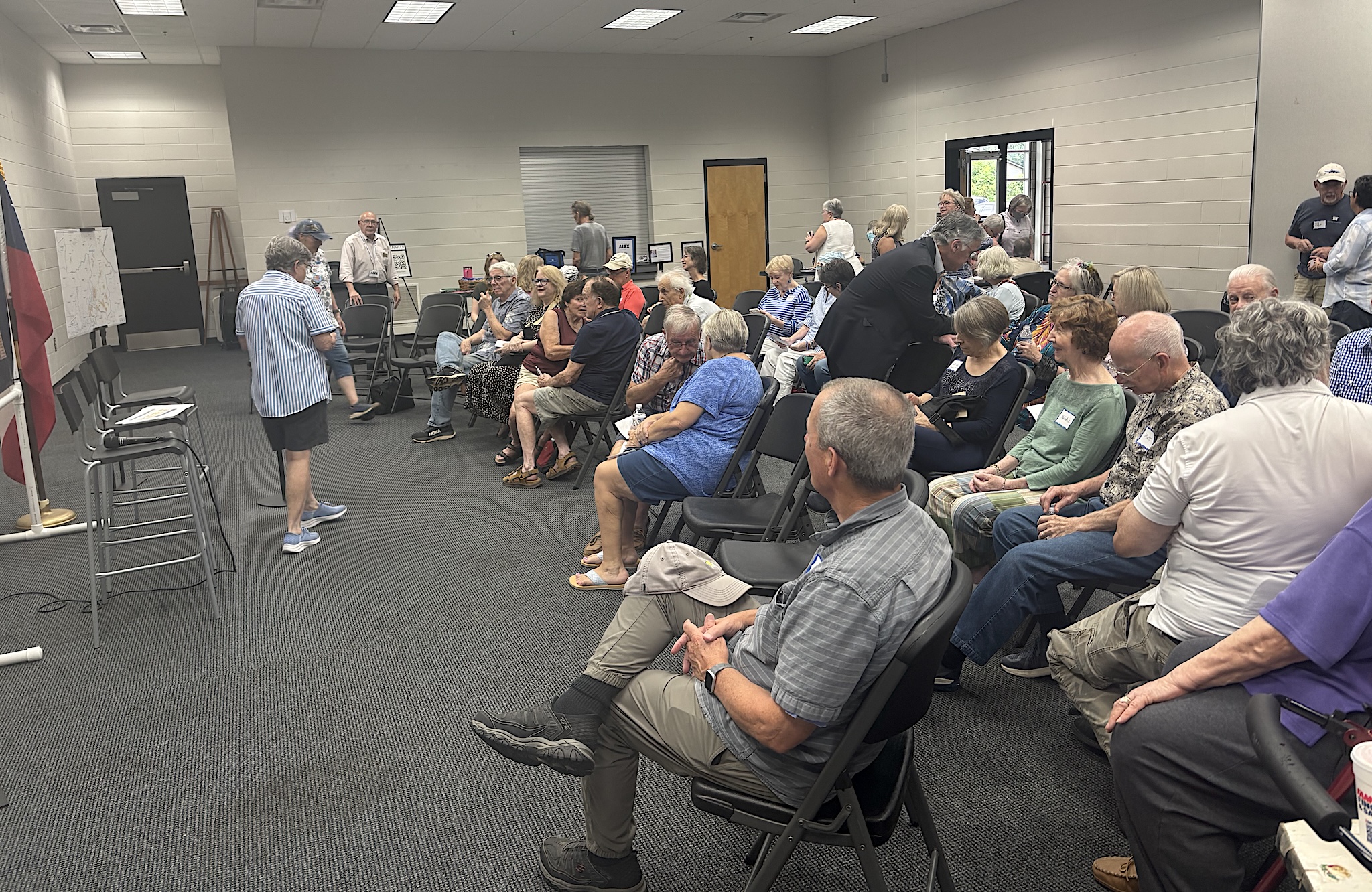 9th District congressional candidate Nick Alex (in suit jacket) talks with voters as they file in for his Clarkesville campaign event. Approximately 50 people turned out for the event at the Habersham County Recreation Department on Wednesday, August 13, 2025. (photo submitted)