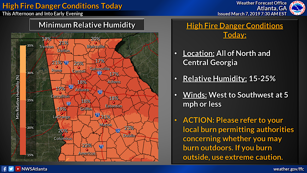 The National Weather Service has issued a High Fire Danger alert for all of North and Central Georgia today due to dry weather conditions.