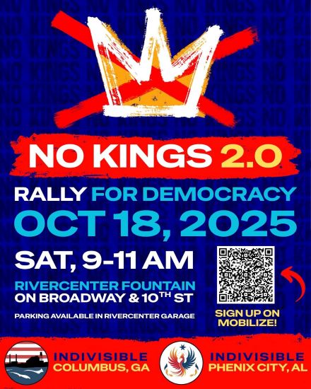 A No Kings 2.0 rally is scheduled in Columbus this Saturday, October 18, 2025. The event will be held from 9:00 a.m. to 11:00 a.m. in front of the RiverCenter on Broadway. The rally is organized by Indivisible Columbus and Indivisible Phenix City.