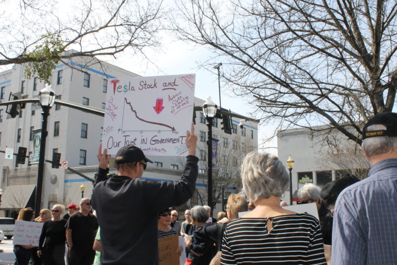 Less than a mile from the office of U.S. Rep. Andrew Clyde, R-Athens, over 50 people from counties across North Georgia took to the square in downtown Gainesville to protest federal budget cuts under President Donald J. Trump’s administration and the Department of Government Efficiency (DOGE), led by Elon Musk.