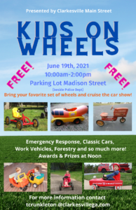 Hit the road (or the sidewalk, really) with Kids on Wheels in downtown Clarkesville. Bring your kids’ favorite set of wheels and check out classic cars, emergency vehicles, cruise with Smokey the Bear and more at this free, family-friendly event. Engines and pedals rev at 10:00 am and run to 2:00 pm in the Madison Street parking lot.