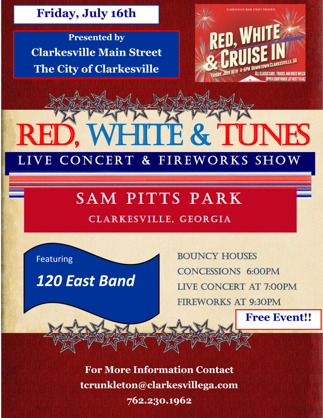 Clarkesville Main Street will also present their “Red, White and Cruise-In,” featuring classic cars, trucks and bikes. This event starts at 4 p.m. and will take place in the upper courthouse lot, next to the gazebo.