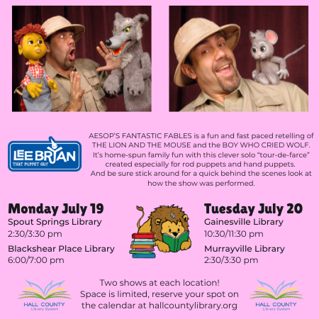 From 10:30 a.m. to 11:30 a.m., catch Lee Bryan, “That Puppet Guy,” at the Gainesville Library! Bryan will perform charming retellings of Aesop’s Fables with puppets kids are sure to love. Learn more about other showings and reserve your spot on the library’s website.