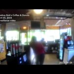 See moment tire crashes into donut shop