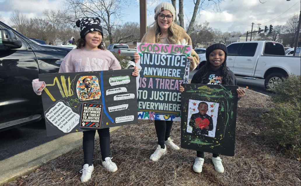 Lucy Lovell and Milly Lovell attend the Martin Luther King Jr. Day march in downtown Gainesville with their mother, holding signs as participants made their way through the city. (Carly McCurry / Now Habersham)