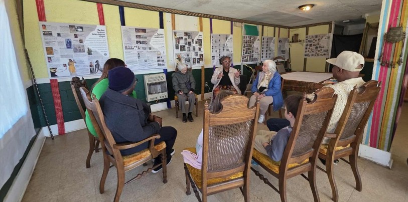 Participants formed a loose circle of mismatched chairs—wooden frames with velvet seats, patterned cushions worn smooth—familiar to anyone raised in Southern homes, city or rural. Introductions moved across generations, from longtime residents to newcomers, including Shady Grove Baptist Church pastor Sherrod Aiken and his wife, Jalessa Aiken.