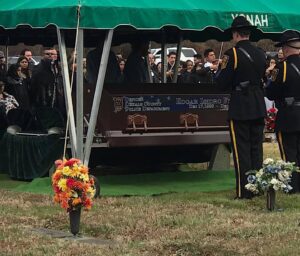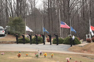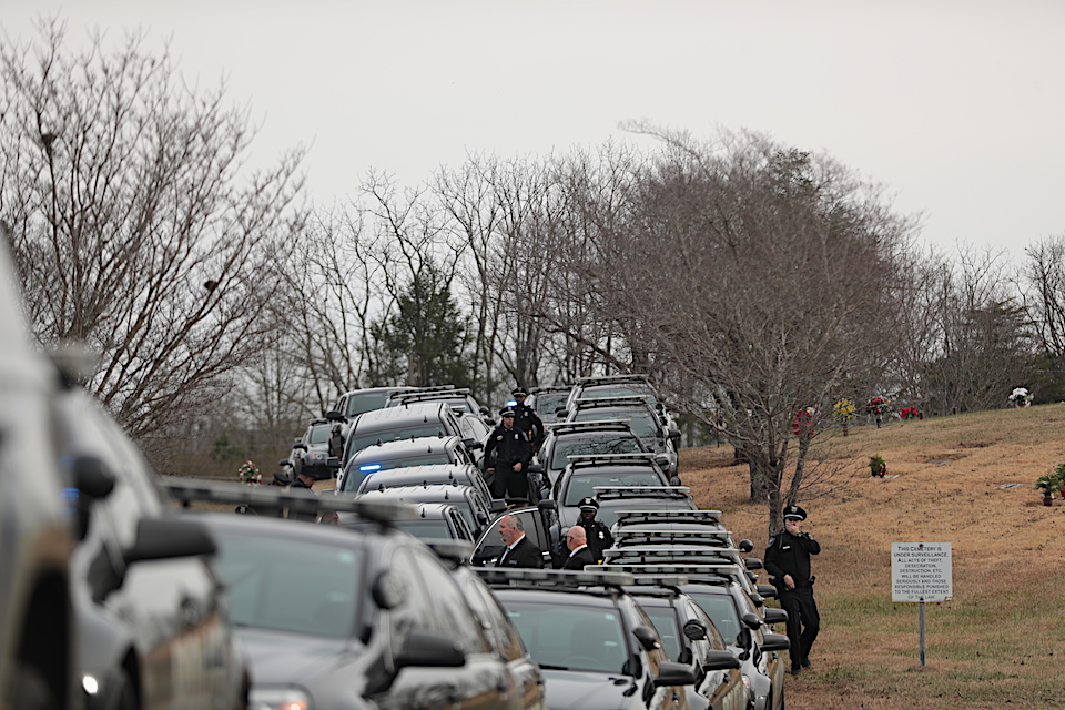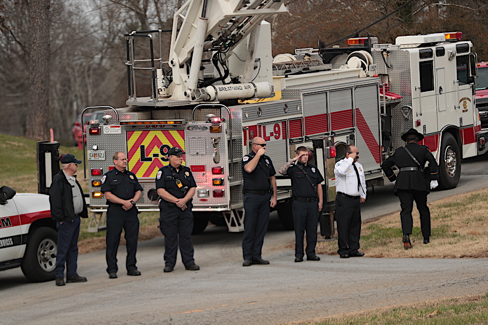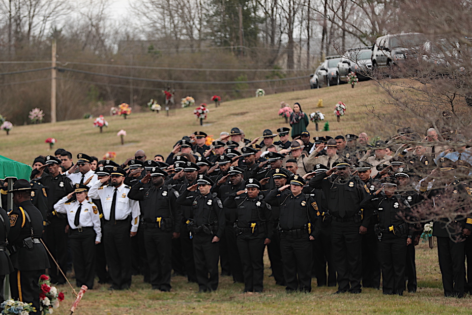 Law enforcement officers salute as Officer Edgar Flores’ body is escorted into Yonah Memorial Gardens in Demorest for burial. (Daniel Purcell/Now Habersham)